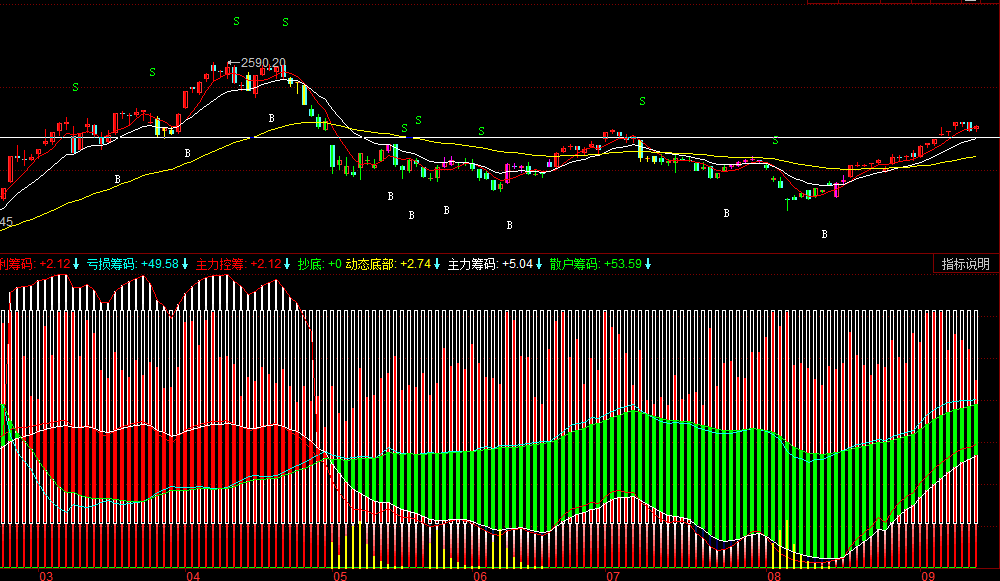 主力控筹:IF(获利筹码>亏损筹码,获利筹码*2,获利筹码),,COLORRED;