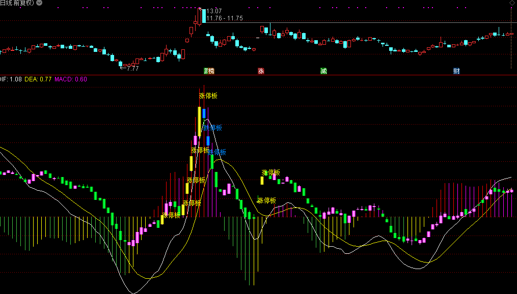 DRAWTEXT(ZTB,IF(ZJC<0,ZJC*0.9,ZJC*1.1),'涨停板')COLORYELLOW;