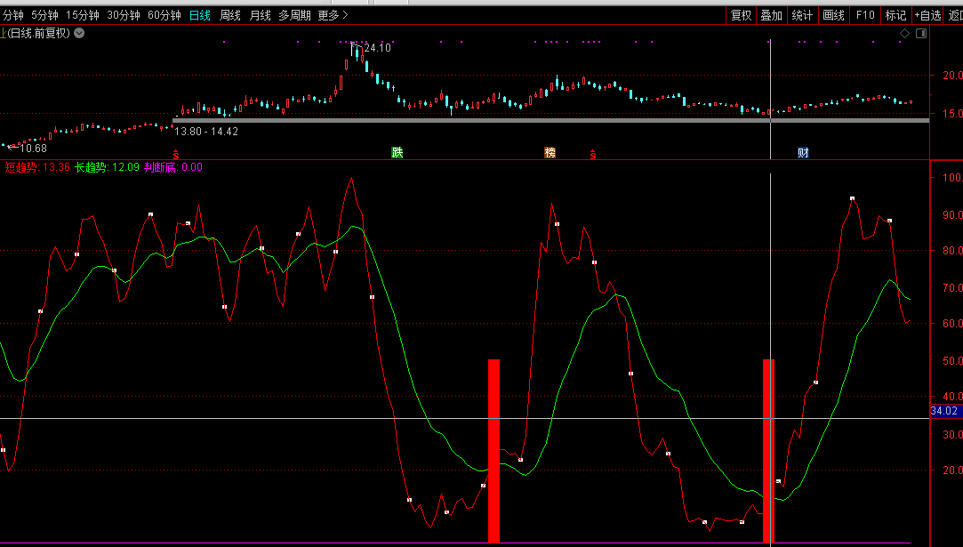 底部:STICKLINE(短趋势<10 AND 判断底>0,0,30,6,1);