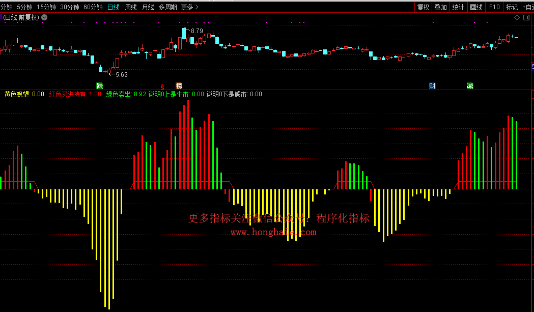 黄色观望:IF(控盘<0,控盘,0),COLORYELLOW,NODRAW;