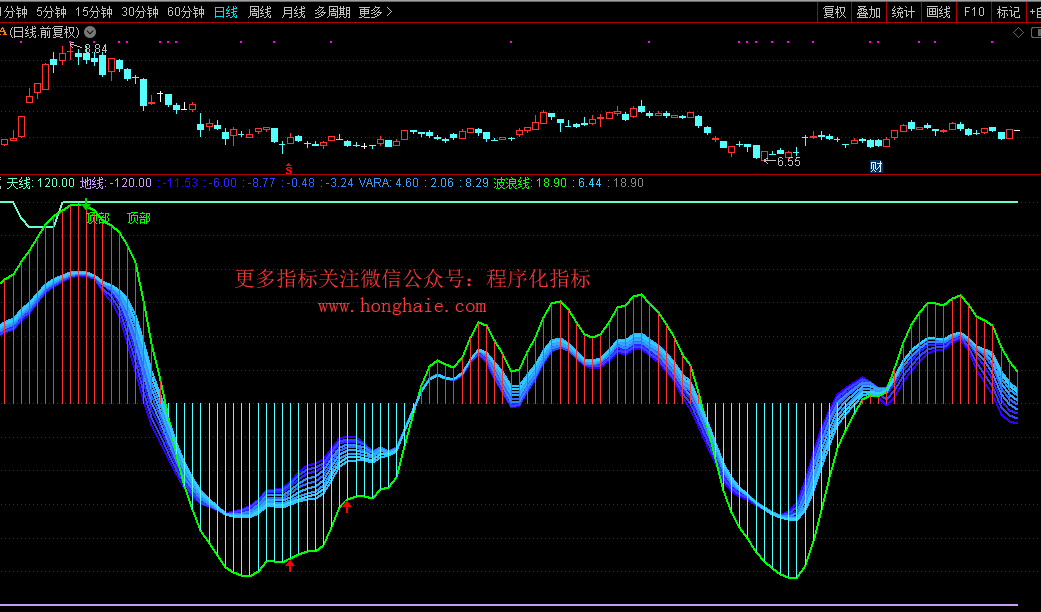 波浪线:SMA((VAR11-50)*2,3,1)+SMA((VAR10-50)*2,3,1)/2,LINETHICK2,COLORGREEN;