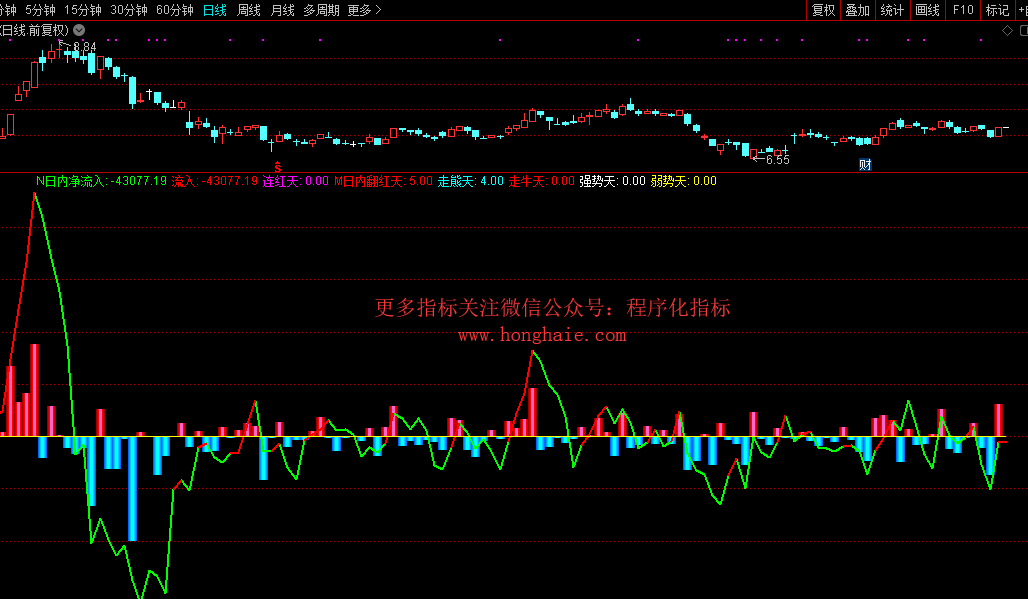 M日内翻红天:COUNT(进出量>0,M),COLORRED;