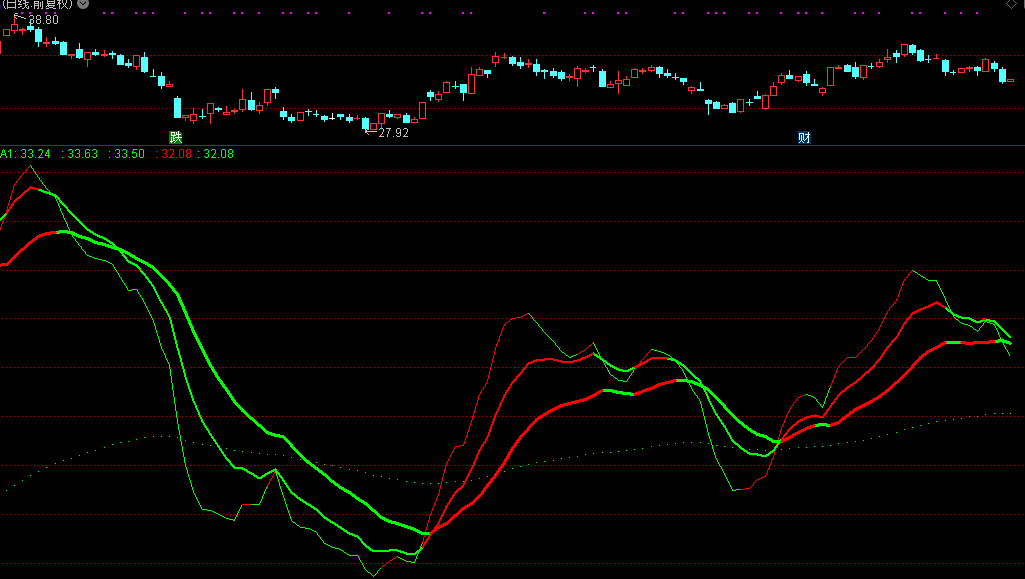 IF(EMA((LOW+CLOSE+OPEN)/3,28)>REF(EMA((LOW+CLOSE+OPEN)/3,28),1),REF(EMA((LOW+CLOSE+OPEN)/3,25),1),DRAWNULL),LINETHICK3,COLORRED;