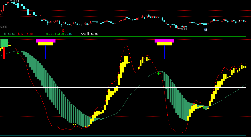 STICKLINE(DIFF>=0 AND DEA>=DIFF AND REF(DIFF,1)>REF(DEA,1),94,97,30,0),COLOR00FFFF;