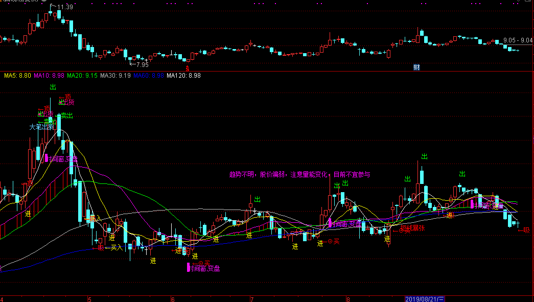 ,'该股走势趋弱,量能不足,减持大部分筹码'),COLORFF00FF ;