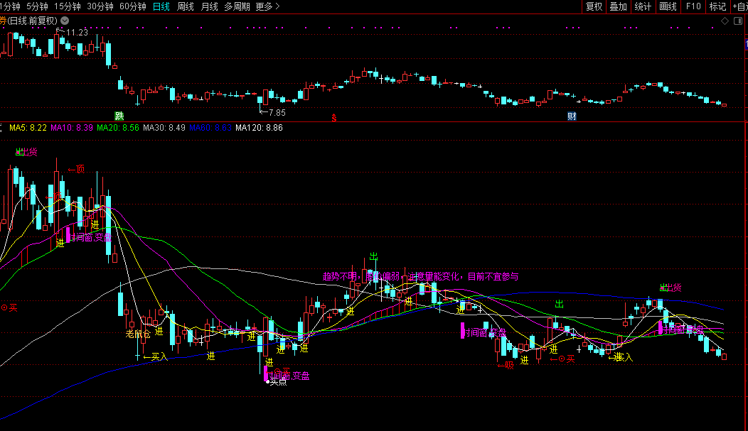 ,'趋势不明,股价偏弱,注意量能变化,目前不宜参与'),COLORFF00FF ;