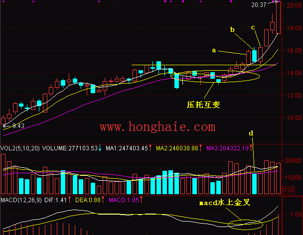 图形特征:第一天图中a线所指的一根阳线突破了前头部T线,这是多方在一段时间以来的第一次向上发动行情。第二天b线所指的阴线对前头部T线进行反压,但反压时成交量萎缩,见图中d线所指,这是对前头部进行夯实,又可以清洗浮动筹码。第三天平开稍微下探后就拉起,收盘后股价已经突破昨天的阴线实体,完成了对前头部的突破确认,第四天跳空开盘,成交量开始放大,至此一轮上扬行情就此展开。