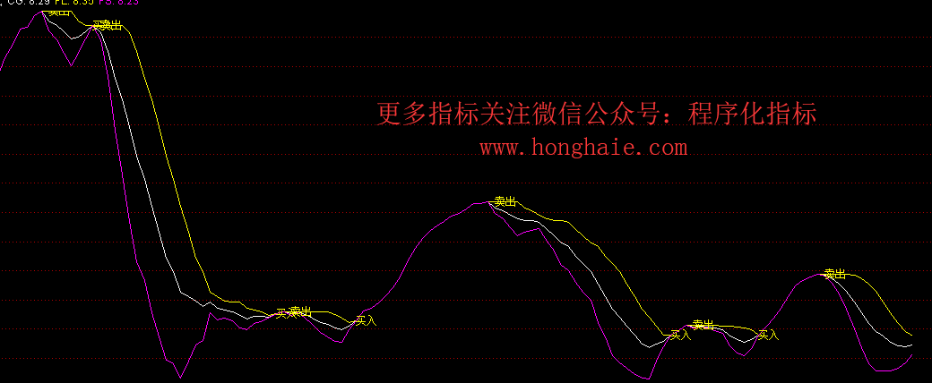 DRAWTEXT(FL>FS AND REF(FL,1)=REF(FS,1),FL,'卖出'),COLORYELLOW ;