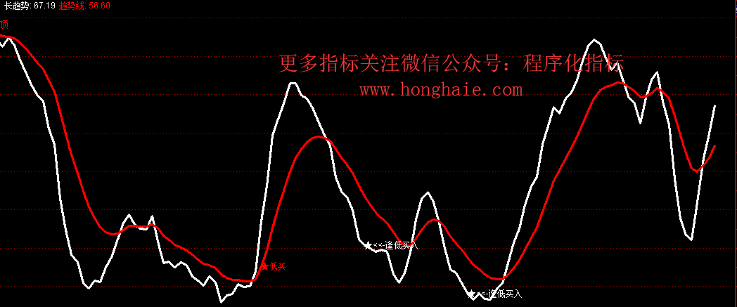 ★低买:DRAWTEXT(REF(CROSS(长趋势,趋势线),1) AND 长趋势>1.3*趋势线,趋势线,'★低买'),COLORRED,LINETHICK1;