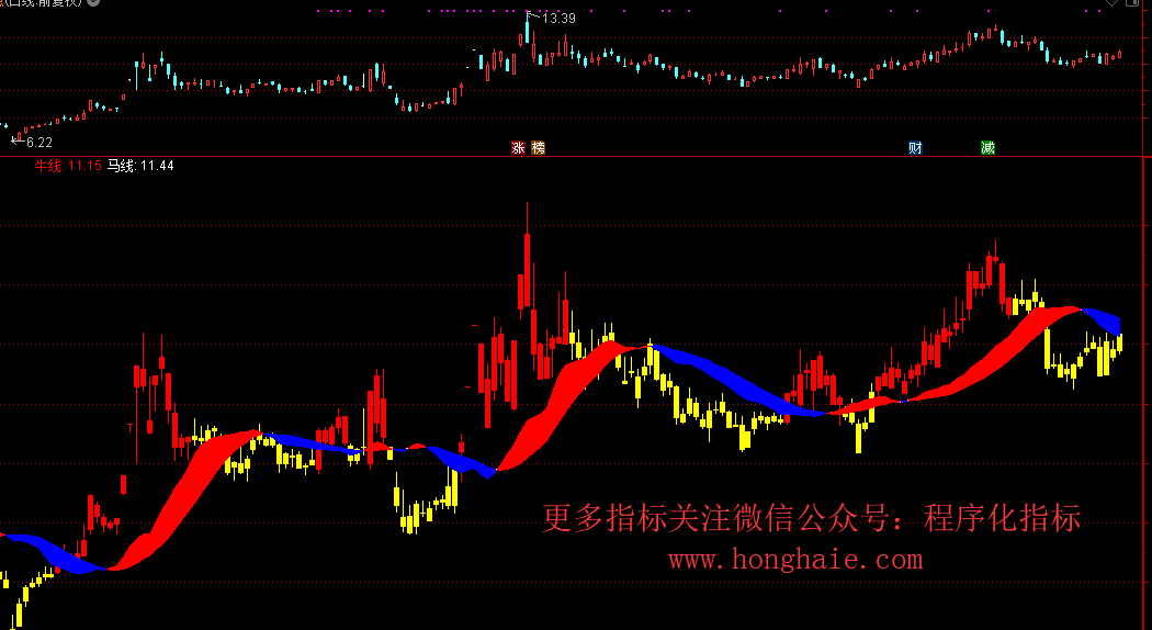 MID:=(1*CLOSE+LOW+OPEN+HIGH)/4;DRAWTEXT_FIX(1,0.02,0,0,'☆微信公众号:(程序化指标) ☆'),COLORRED;
