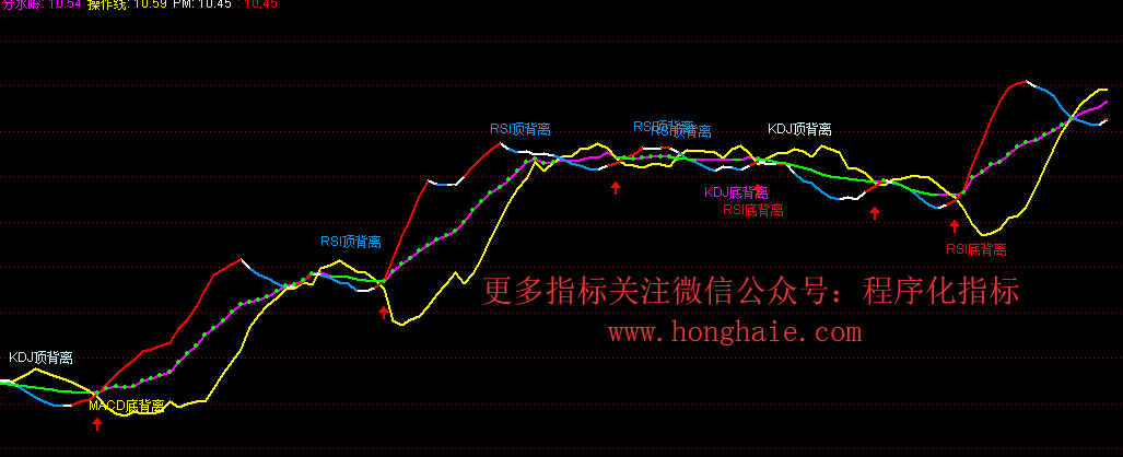 DRAWTEXT(D1> 0,H+0.16,'MACD顶背离'),COLOR00FF00;{MACD顶背离}