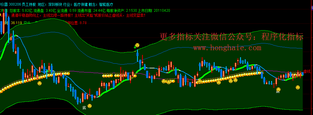 DRAWTEXT_FIX(1,0.001,0.10,0,'操作说明:通道平稳趋势向上,主线出绿一路持股!主线出“笑脸”或股价站上虚线买,主线变蓝卖!')COLOR0000FF;