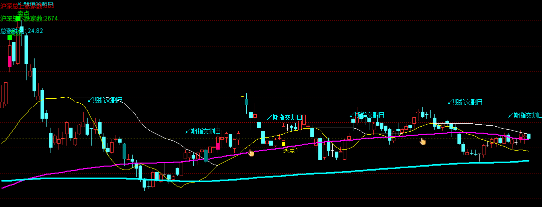 DRAWTEXT(期指交割日,H+0.35,'↙期指交割日'),COLORCYAN;