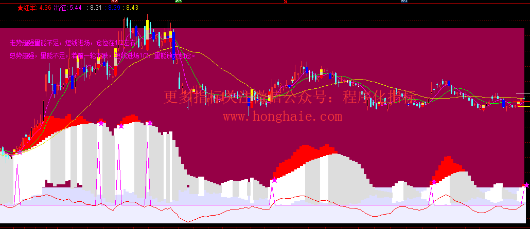 DRAWTEXT_FIX(大盘2,0.06,TS18,0,'总势趋强,量能不足,若前一轮下跌,短线进场1/2,量能放大加仓。'),COLORFF00FF;