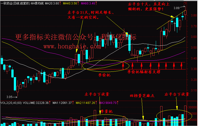 3.强势季托的显著特点就是有“左平台”和“右平台”,左平台是指在这个季托三角形的左边出现的浮出水面的K线平台,要求空间高度尽量高,时间长度尽量长。右平台就是指在这个季托三角形的右边、季均线之上出现的K线平台,其中以右上斜平台最具爆发力。