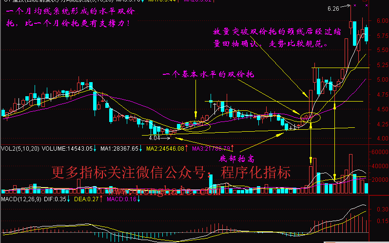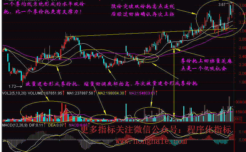 (2) 一个低位的价托使股价抬高到一定的震荡洗筹位,此时股价很难再回到低位的价托位。如果震荡洗筹后再次形成价托,说明股价受到双重支撑,还会有上升空间。