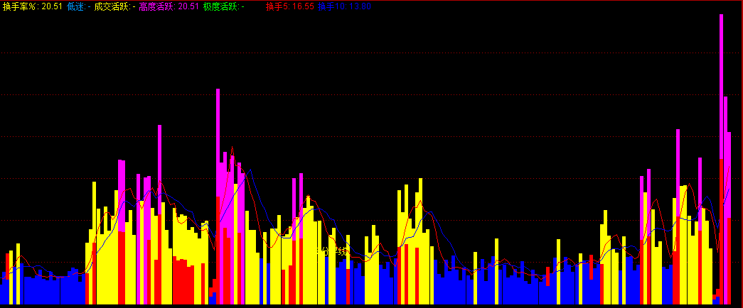 高度活跃:IF(换手率%>15 && 换手率%<=35,换手率%,DRAWNULL)COLORMAGENTA,NODRAW;