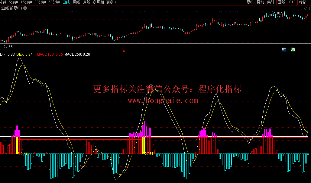 STICKLINE(MACD>=MACD250,MACD250,MACD,2,0),COLORMAGENTA;