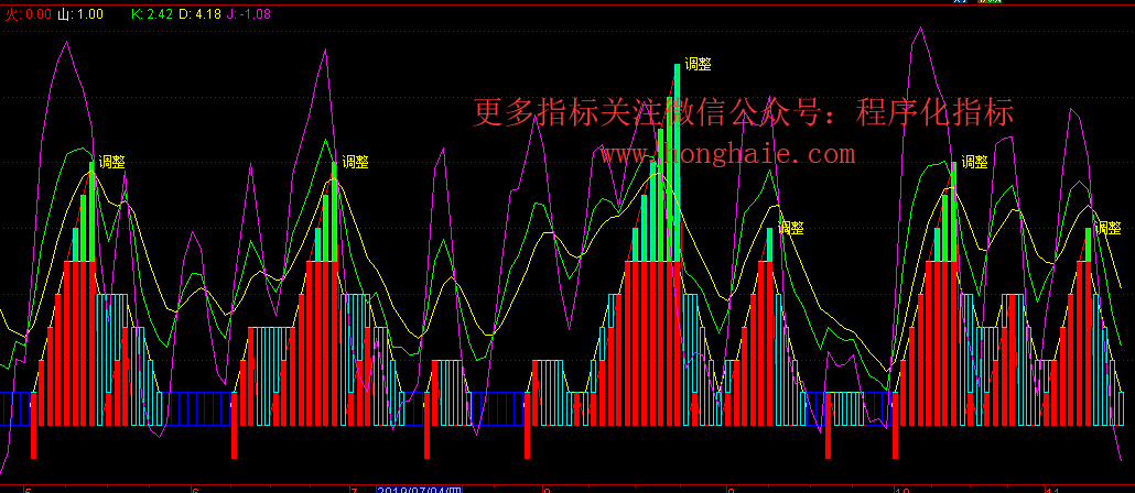 DRAWTEXT(REF(火,3)>0 AND REF(火,2)>0 AND REF(火,1)>0 AND 火=0 AND REF(火,1)>山,REF(火,1),'调整'),COLORYELLOW , ;