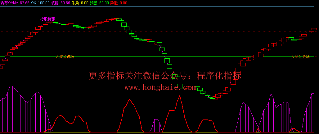 DRAWTEXT(VAR27 AND COUNT(VAR27,30)=1,90,'持股待涨'),COLORFF00FF;