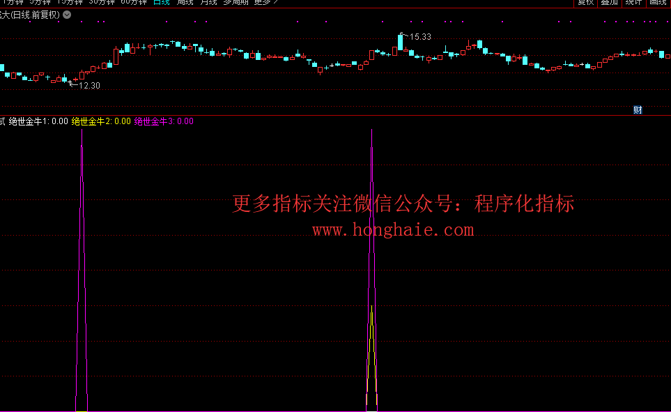 绝世金牛1:IF((A AND B AND 避开刀尖 AND COUNT(A AND B AND D,20)=1),50,0);