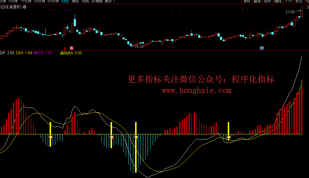STICKLINE(启动点,0.4,MACD,2,0),COLORYELLOW;
