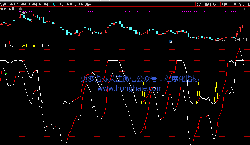 IF(双线>REF(双线,1),双线,DRAWNULL),LINETHICK2,COLORRED;