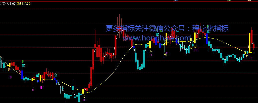 STICKLINE(买线<卖线,LOW,HIGH,0,0),COLORFFFF00;