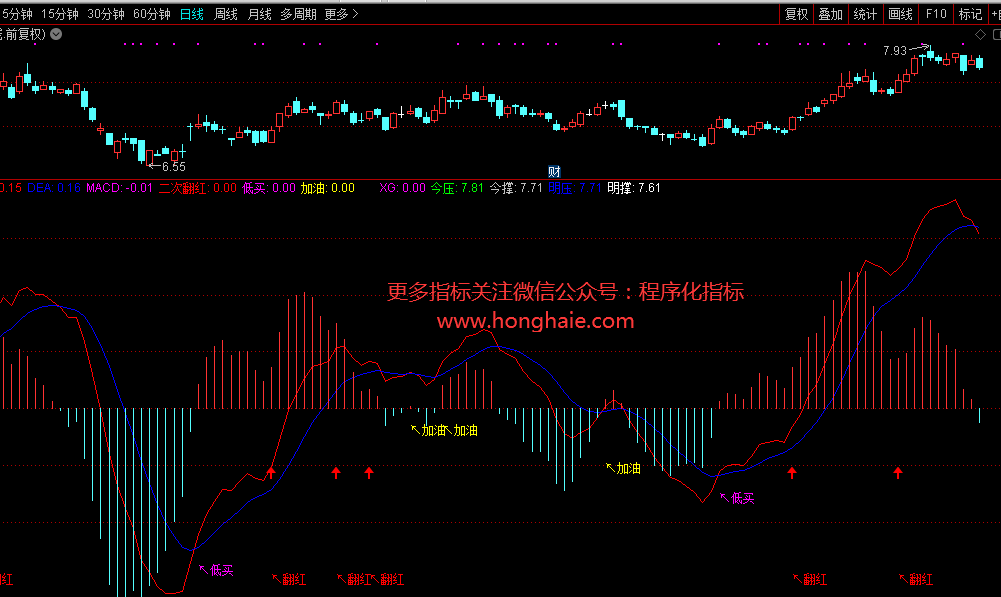 DRAWTEXT(CROSS(DIF,DEA) AND DIF<0,DEA-0.02,'↖低买'),COLORFF00FF;