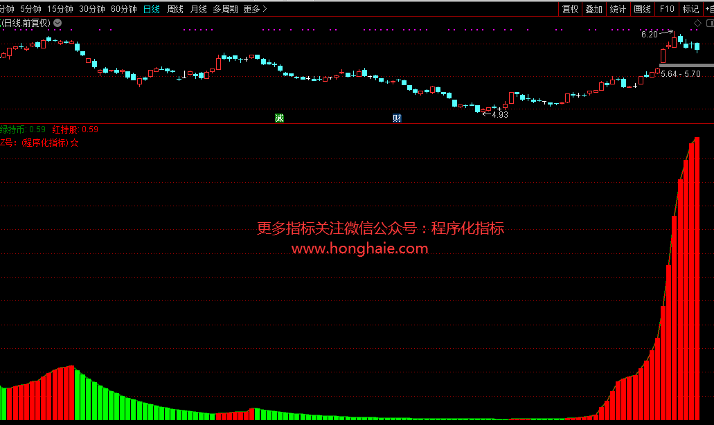DRAWTEXT_FIX(1,0.02,0,0,'☆微信公众号:(程序化指标) ☆'),COLORRED;