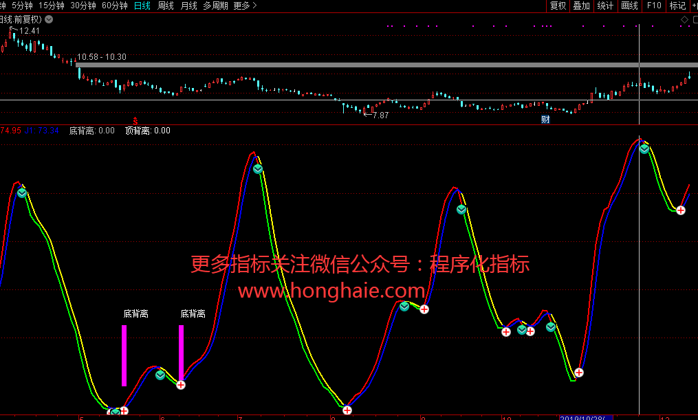 底背离:REF(CLOSE,A1+1)>CLOSE AND J>REF(J,A1+1) AND CROSS(J,J1) AND J<20,NODRAW;