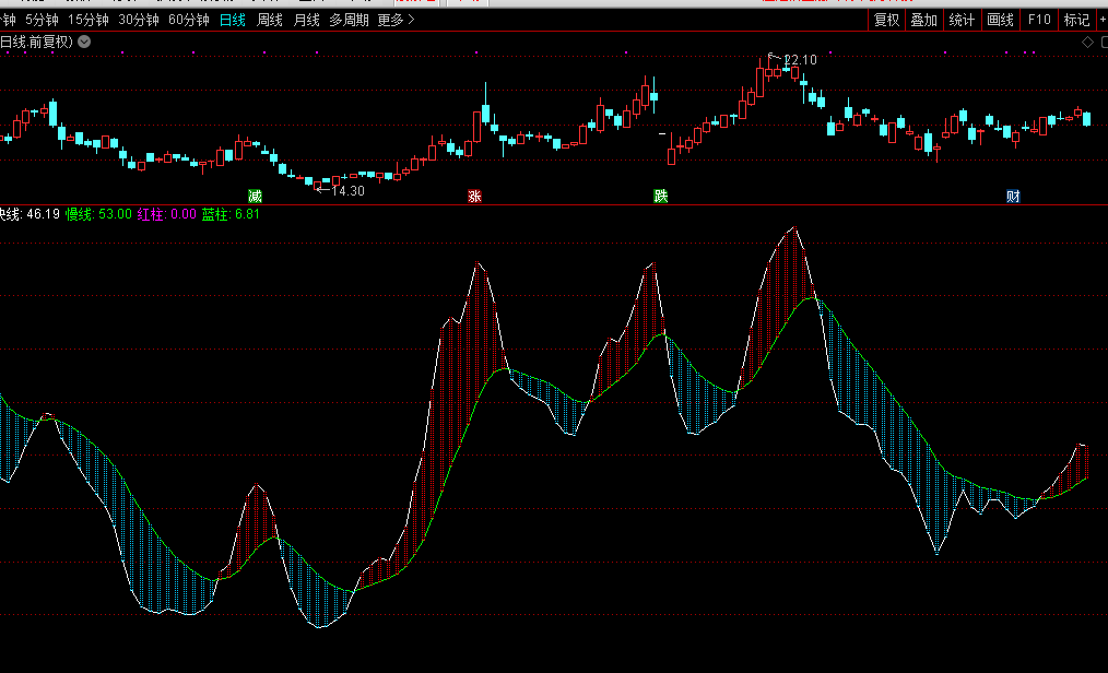蓝柱:IF((快线 - 慢线) < 0,(ABS(快线 - 慢线)),0),LINETHICK0;