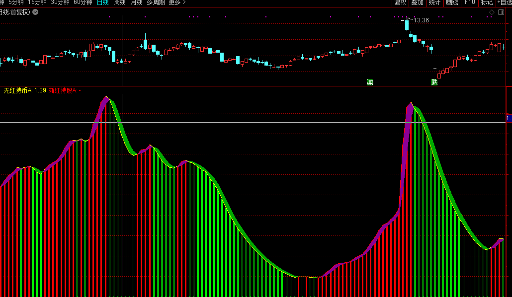 渐红持股A:IF(无红持币>REF(无红持币,1),无红持币,DRAWNULL),COLORRED,LINETHICK1;