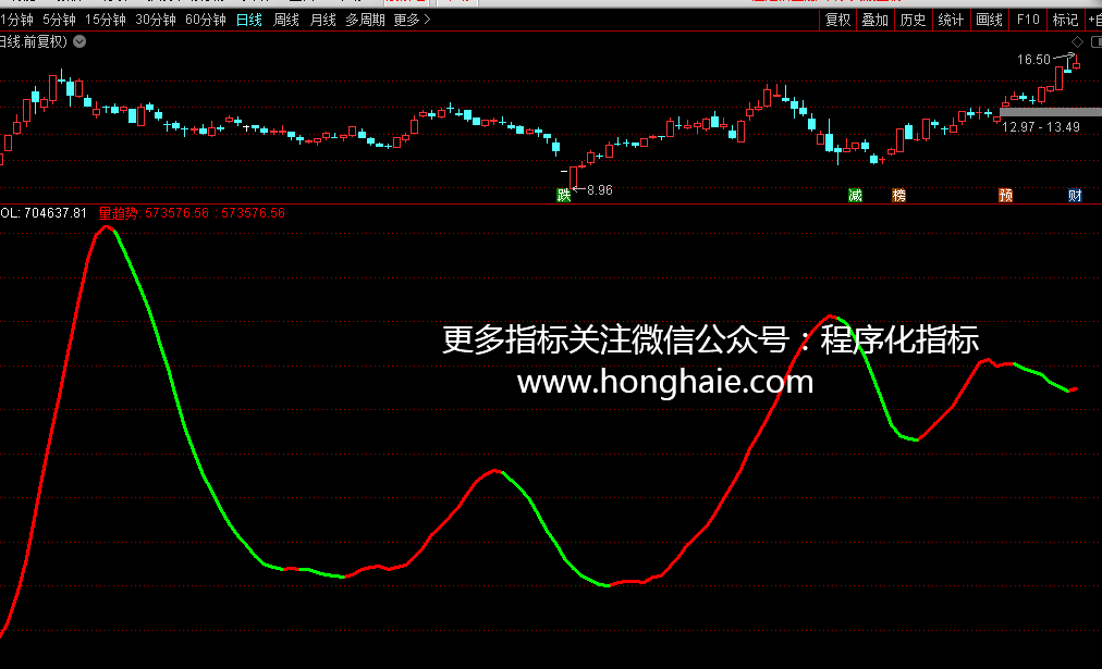 IF(量趋势<REF(量趋势,1),量趋势,DRAWNULL),COLORGREEN,LINETHICK3;