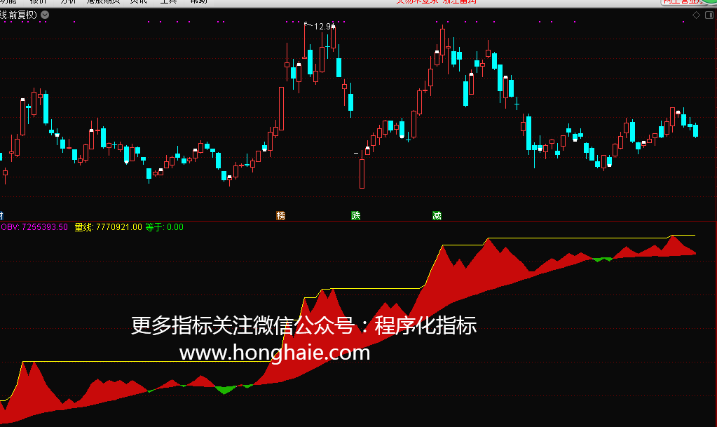 OBV:SUM(IF(CLOSE=REF(CLOSE,1),0,A1),0),COLORMAGENTA;