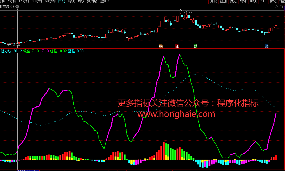 做空:IF(空方>拉升力B,拉升力B,空方)*4.5,LINETHICK2,COLOR00FF00;