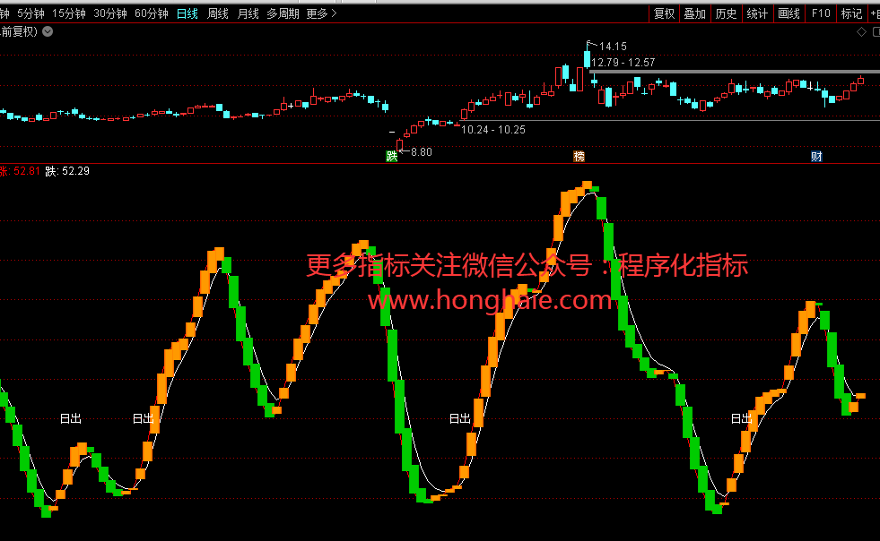 DRAWTEXT(CROSS(涨,跌) AND 跌<20 AND 跌>-10,40,'日出'),COLORFFFFFF;