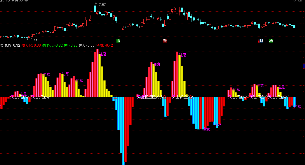 DRAWTEXT(CROSS(REF(净流,1),净流),净流-0,'注意'),COLORMAGENTA;