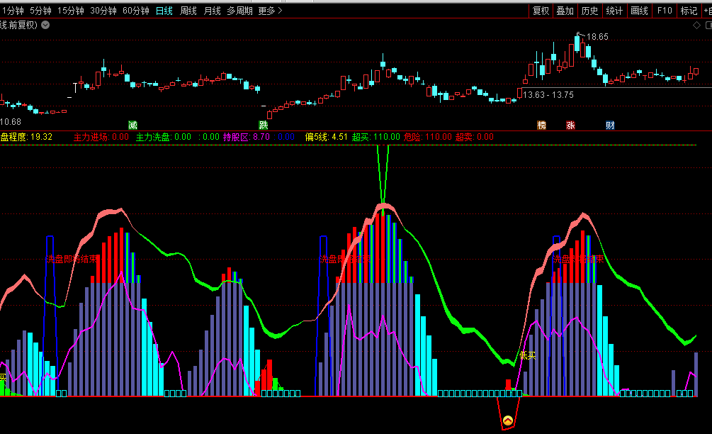 主力洗盘:IF(PVAR5<REF(PVAR5,1),PVAR5,0),COLORGREEN,LINETHICK1;