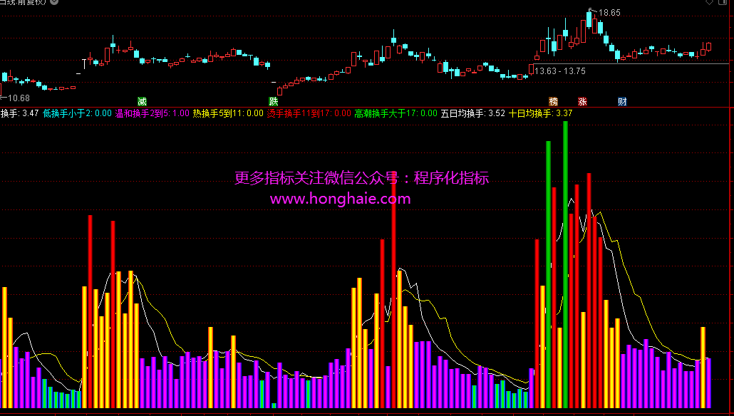 STICKLINE(换手>2 AND 换手<5,0,换手,0.3,0)COLORFF00FF;