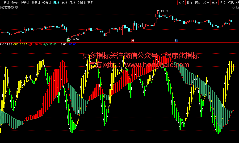 DRAWTEXT_FIX(1,0.02,0,0,'☆微信公众号:(程序化指标) ☆'),COLORRED;