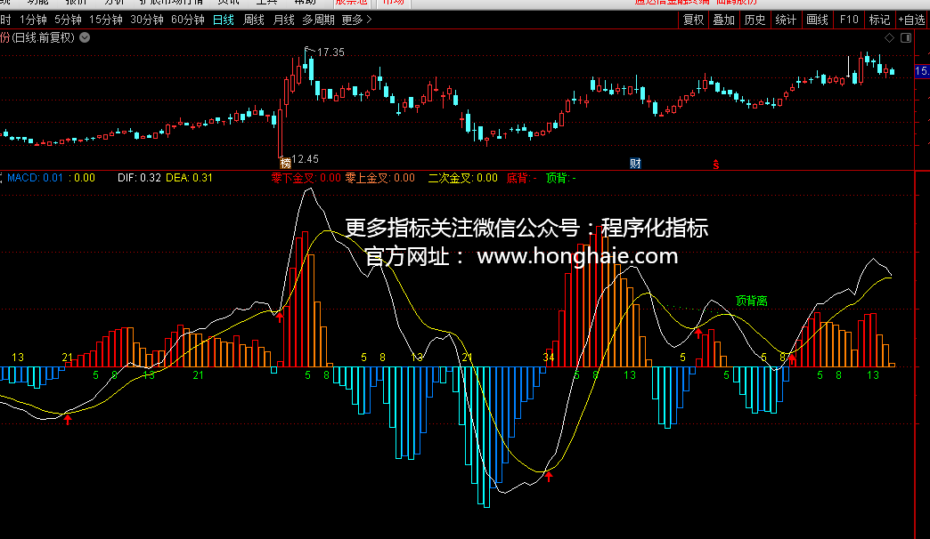 底背离:=REF(CLOSE,A1+1)>CLOSE AND DIF>REF(DIF,A1+1) AND CROSS(DIF,DEA);