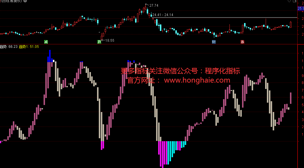 趋势: 5*SMA((CLOSE-LLV(LOW,27))/(HHV(HIGH,27)-LLV(LOW,27))*100,5,1)-3*SMA(SMA((CLOSE-LLV(LOW,27))/(HHV(HIGH,27)-LLV(LOW,27))*100,5,1),3,1)-SMA(SMA(SMA((CLOSE-LLV(LOW,27))/(HHV(HIGH,27)-LLV(LOW,27))*100,5,1),3,1),2,1),LINETHICK0,COLOR7F52AF;