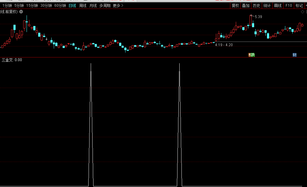 三金叉:CROSS(MA(C,5),MA(C,10)) AND CROSS(DIF,DEA) AND CROSS(MA(V,5),MA(V,10));