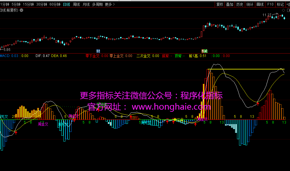 前1高:REF(MACD,BARSLAST(MACD1)),COLORYELLOW,LINETHICK2;