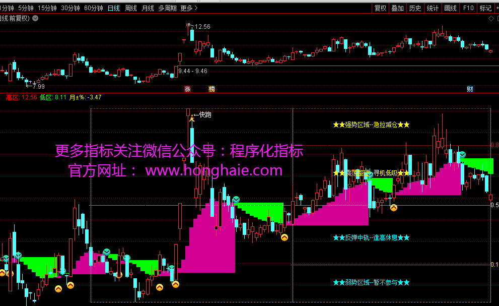 DRAWTEXT(CURRBARSCOUNT=N1/2-10,GD-KJ/12,'★★强势区域--急拉减仓★★'),COLOR00FFFF;
