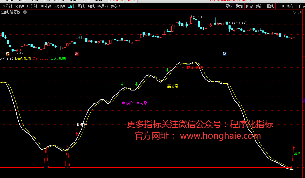 DRAWTEXT(CROSS(DEA,DIF) AND DEA>75,80,'波峰'),COLORRED;