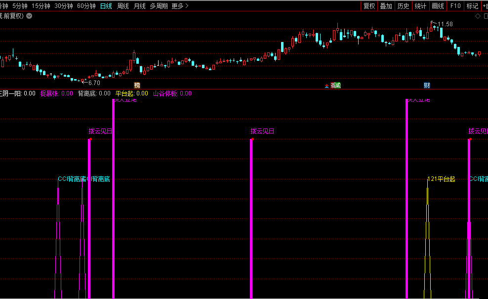 拨云见日:STICKLINE((LAST(C<O,6,3) AND LAST(C>O,2,0)) OR (LAST(C<O,6,3) AND C>O AND REF(C,1)<REF(O,1) AND REF(C,2)>REF(O,2)),4,0,2,0),COLORMAGENTA;