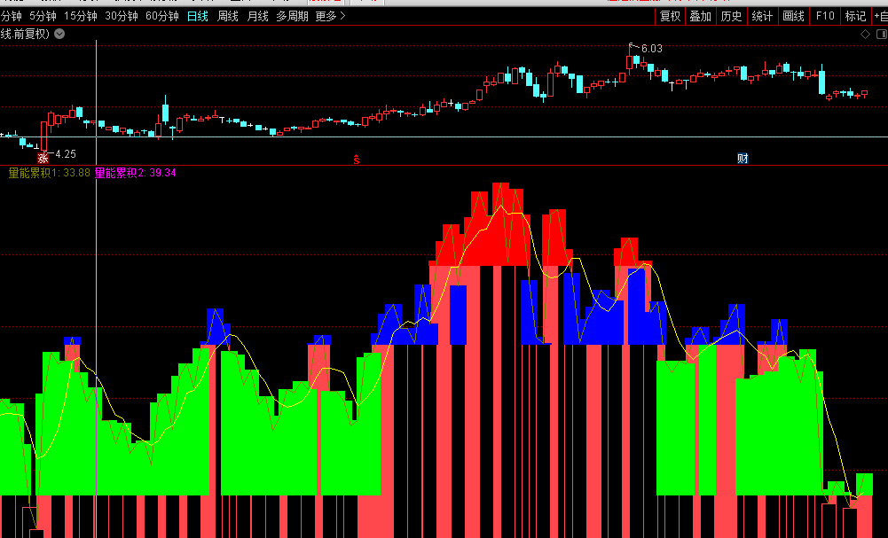 红空芯:STICKLINE(量能累积<REF(量能累积,1) AND 量能累积>0,量能累积,0,8,1),COLOR4D48FF;