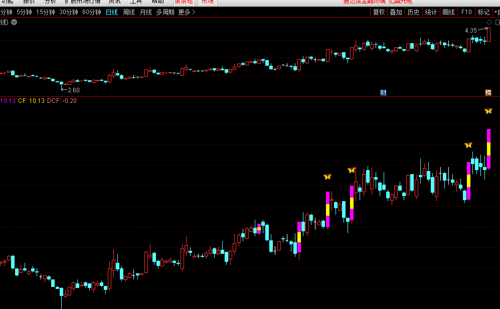 STICKLINE(PERIOD=5 AND CF>1.0975 AND H=C AND O<>C,O+(H-O)/3*2,C,2.5,0),COLORMAGENTA;